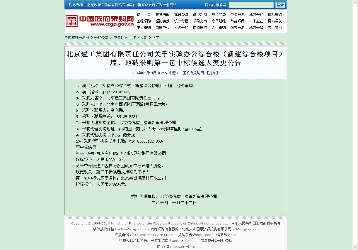 中國政府采購網中國石油大學(北京)實驗辦公綜合樓(新建綜合樓項目)墻地磚采購中標候選人變更公告