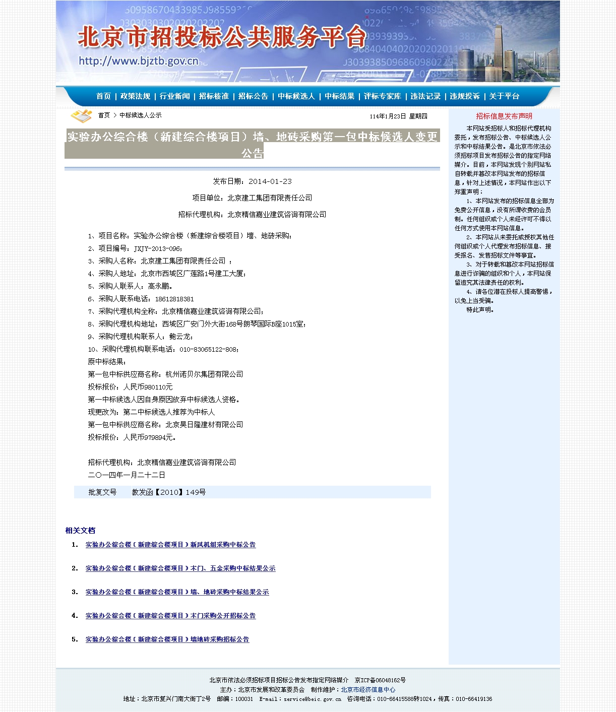 附圖:北京市招投標公共服務平臺網中國石油大學(北京)實驗辦公綜合樓(新建綜合樓項目)墻地磚采購中標候選人變更公告
