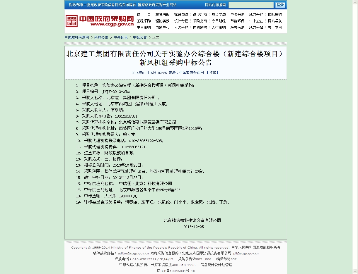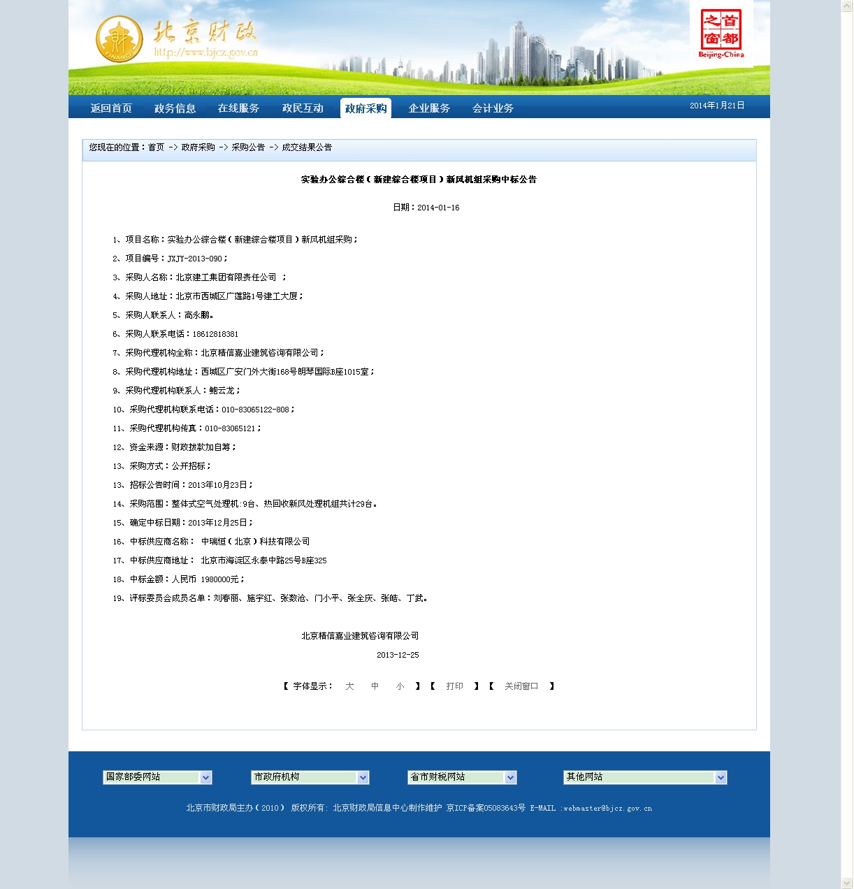 北京市財政局網站實驗辦公綜合樓(新建綜合樓項目)新風機組采購中標公告: