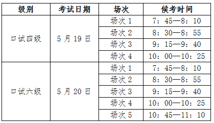 為了確保5月19日、20日全國大學(xué)英語四、六級口語考試的順利進(jìn)行,現(xiàn)將候考時間、候考要求、候考教室通知如下: