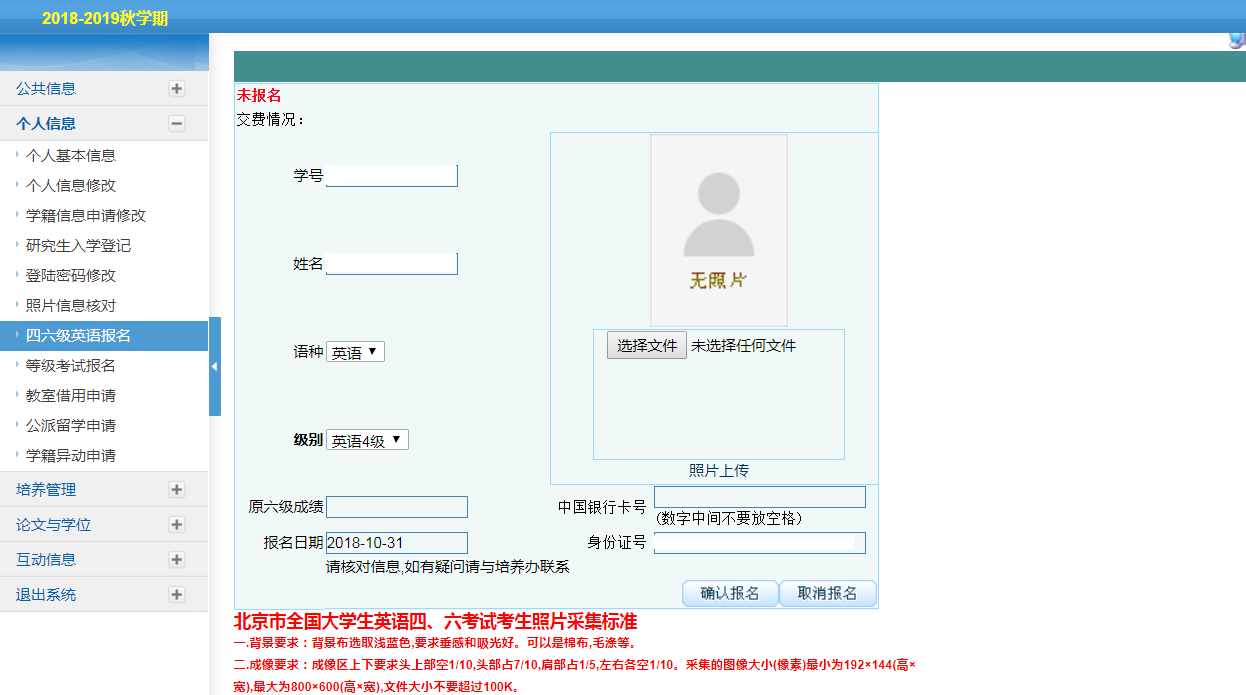 由于本次測試不收取考費,中國銀行卡號統一填寫為:1111111111111111111(數字中間不能有空格共19位,一旦確認不得修改);請仔細核對身份證號,并按照要求上傳照片:登錄研究生系統后,若考生有學籍照片,將照片另存為JPG格式并以學號命名后上傳。若考生無學籍照片,按系統中照片采集要求操作并上傳。選擇照片文件后務必點擊“照片上傳”。完善報名信息后點擊“確認報名”。