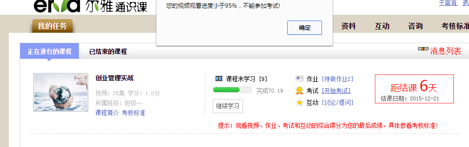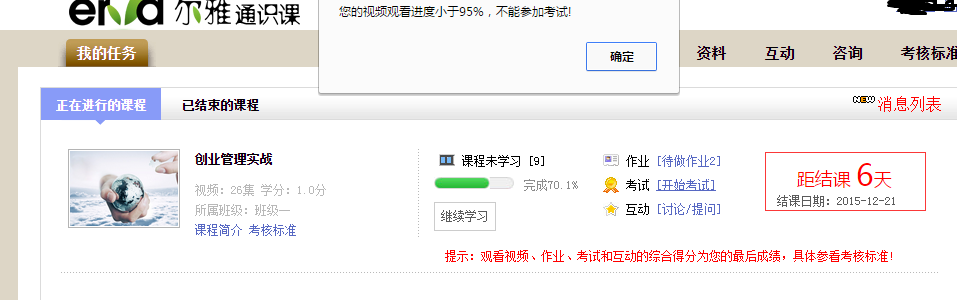 請各位選擇爾雅通識課的同學,如還未完成視頻學習,請在規定的時間內(學習時,系統會提示剩余時間),完成95%的視頻學習,否則無法進行考試。