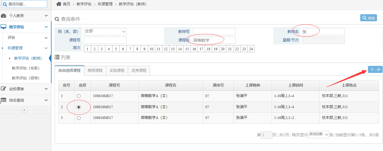 2.結合查詢條件,查找出所要評教的課程。點擊該課程前面的單選按鈕,然后點擊“下一步”。