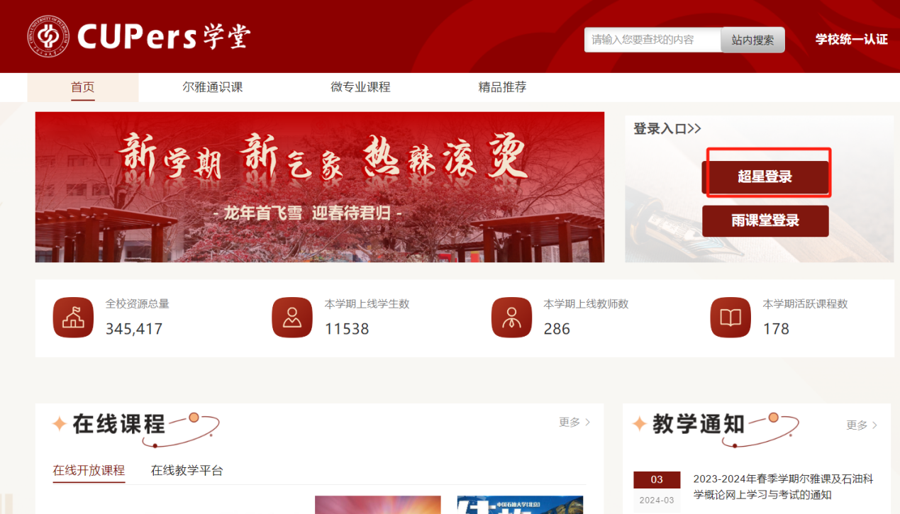 2.使用中國石油大學(北京)網(wǎng)絡(luò)學習平臺,進入CUPers學堂(http://cup.fy.chaoxing.com/),選擇“超星登錄”,點擊“新用戶注冊”,輸入手機號獲取驗證碼,并設(shè)置登錄密碼,然后點擊下一步進入完善信息界面,輸入學號和真實姓名,點擊下一步完成注冊登錄,然后進入個人空間。后續(xù)登錄可以選擇手機號+密碼或者手機號+驗證碼的方式登錄。