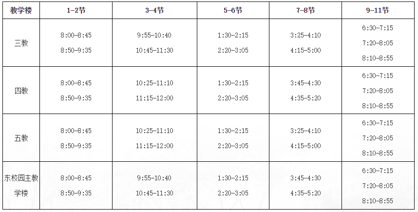 任課老師按照課表安排的節(jié)次和授課地點錯時上課。三教、四教、五教、東校園主教學(xué)樓分為兩個不同的時間段錯時安排上課,每個時間段錯開30分鐘,每小節(jié)授課時長每
