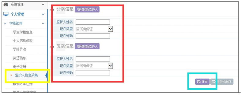 (1)登錄教務(wù)系統(tǒng),“個(gè)人管理”→“學(xué)籍管理”→“監(jiān)護(hù)人信息采集”,填寫(xiě)完成后點(diǎn)擊“保存”。