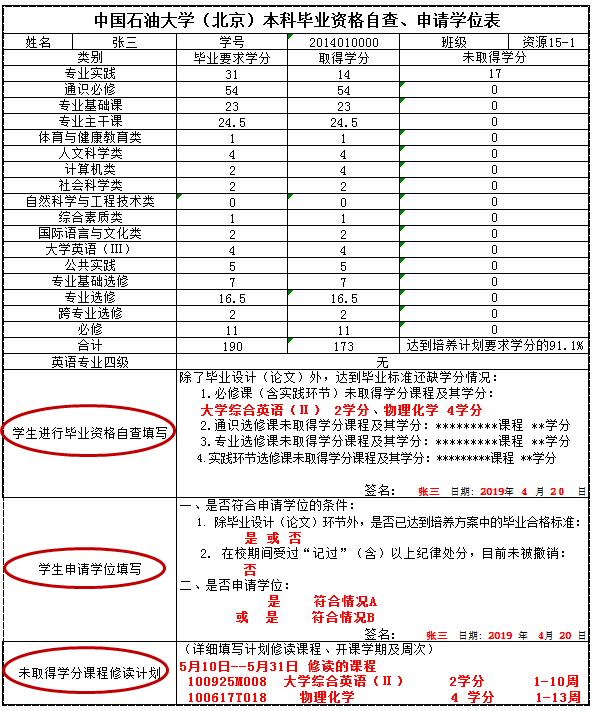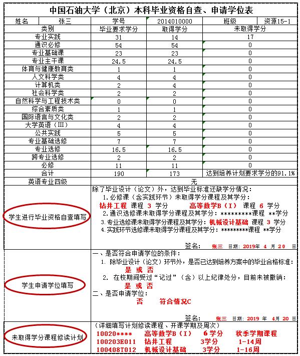 根據(jù)所取得學(xué)分,將本人符合的學(xué)位申請情況填寫在“學(xué)生申請學(xué)位填寫”欄,打印后本人簽名確認(rèn)于5月10日前交至學(xué)院。申請學(xué)位樣表見附件。