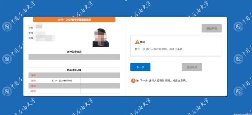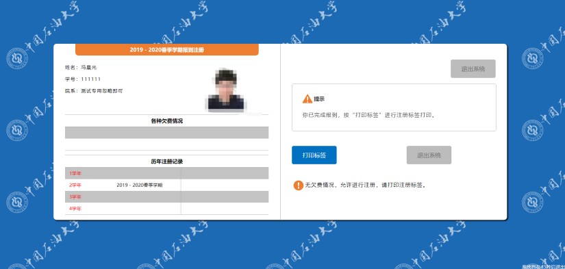 人臉識別成功后,點擊“打印標簽”, 成功打印后,將中間標簽撕下,貼在學生證相應的學期,代表本學期注冊完成。