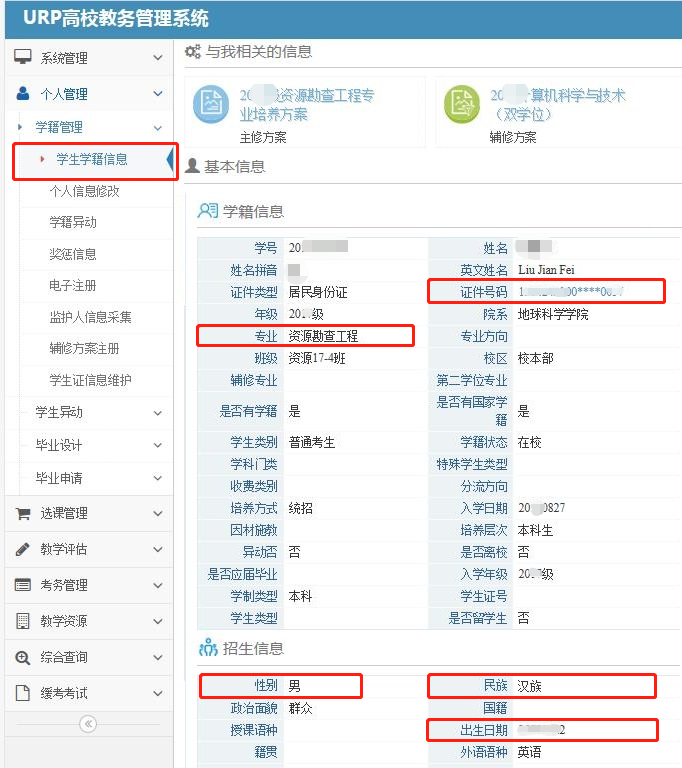 登錄“本科教務(wù)管理系統(tǒng)”,個人管理→學(xué)籍管理→學(xué)生學(xué)籍信息,核對本人證件號碼、專業(yè)、性別、民族和出生日期,如有問題請直接聯(lián)系教務(wù)處(010-89739131)。