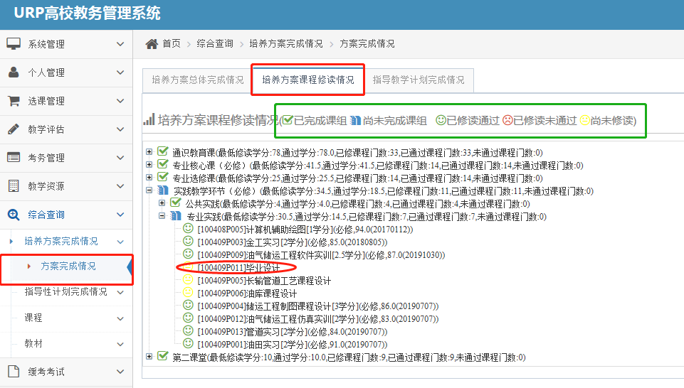 登錄“本科教務(wù)管理系統(tǒng)”,“綜合查詢”→“培養(yǎng)方案完成情況”→“培養(yǎng)方案課程修讀情況”,如下圖所示,在“尚未完成的課組”中,核查課程完成情況。當(dāng)所有課組顯示“已完成課組”時,即表示完成培養(yǎng)方案要求。