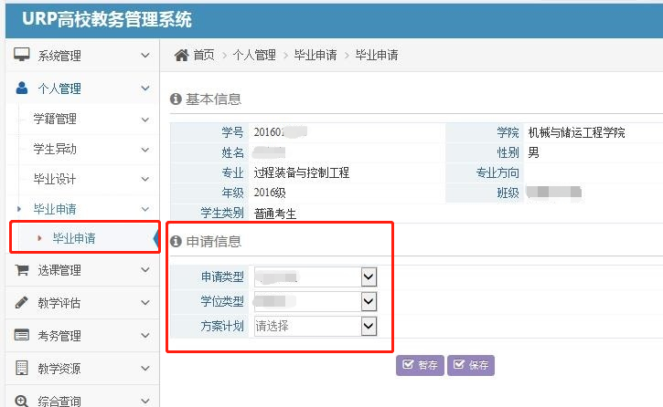 登錄“本科教務(wù)管理系統(tǒng)”,“個人管理”→“畢業(yè)申請”中,點(diǎn)擊右上角“添加新的申請”,出現(xiàn)如下圖頁面。