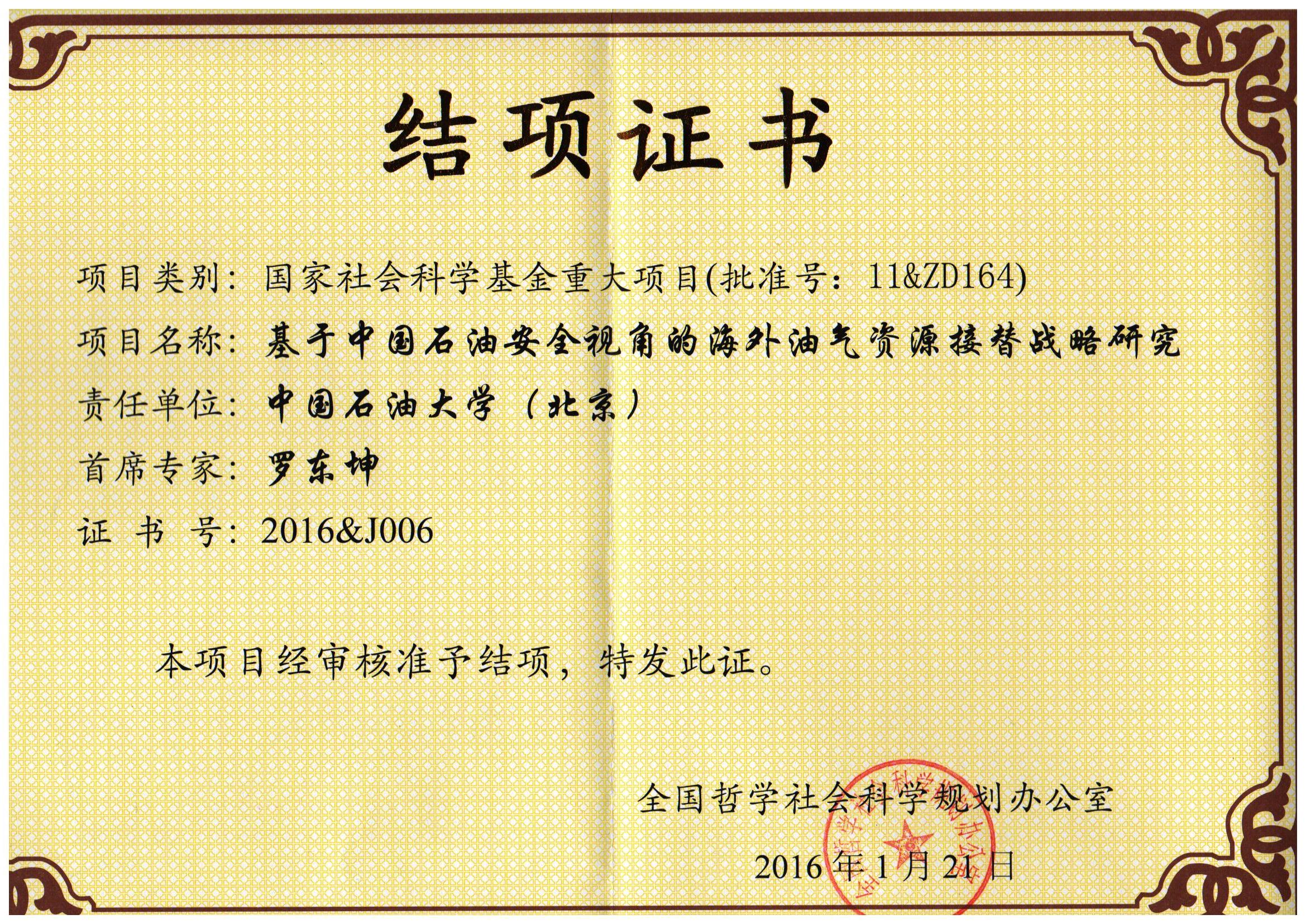 我校工商管理學院羅東坤教授為首席專家承擔的國家社科基金重大項目《基于中國石油安全視角的海外油氣資源接替戰略研究》(批準號11&ZD164)完成預期目標,多項研究成果在國家能源局、中石油集團公司、中石化集團公司等單位得到應用。本項目結項申請成果免鑒定通過審批,準予結項,并頒發結項證書。