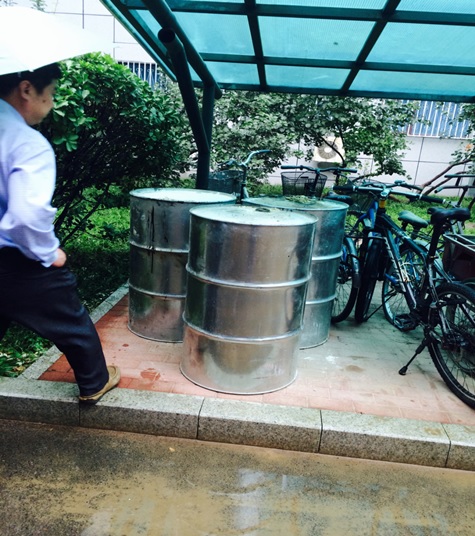 2015年國慶節前科技處保衛處實驗室安全聯合檢查過程中,發現工程東樓西側南端自行車棚內堆放有三個大油桶,存放材料疑似油品類實驗材料,見下圖。