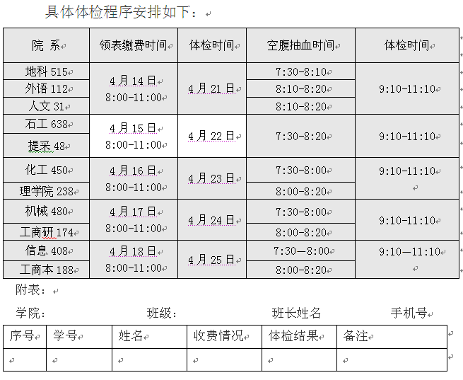 體檢時間定4月21日至4月25日共5天,請各班班長自帶名單(按校醫院統一格式:見附表)按照下表規定的時間到校醫院保健科領取體檢表并交納體檢費,每人38元。注意:凡是參加過2014年研究生面試體檢的畢業生,可以不用參加此次的畢業體檢,請各班班長在備注中標出。