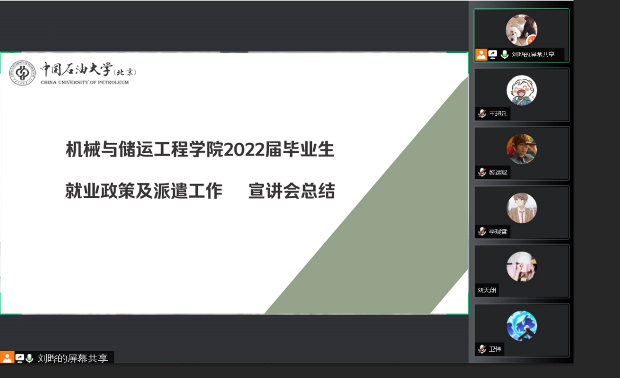 為幫助學(xué)生適應(yīng)就業(yè)形勢(shì)、熟悉就業(yè)政策,清晰了解學(xué)校派遣、改派等相關(guān)工作手續(xù)和內(nèi)容,5月18日,中石大機(jī)械與儲(chǔ)運(yùn)工程學(xué)院通過線上會(huì)議召開了2022屆畢業(yè)生就業(yè)政策及派遣工作宣講會(huì),宣講會(huì)由畢業(yè)班輔導(dǎo)員周小龍擔(dān)任講解,院團(tuán)委書記劉曄及300余名應(yīng)屆畢業(yè)生參會(huì)。