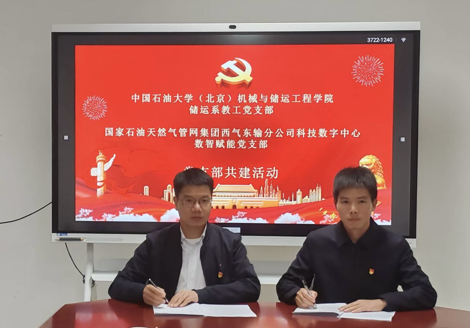 會上,機械與儲運工程學院黨委書記王瑋首先發表致辭,熱烈歡迎西氣東輸分公司中心數智賦能黨支部來學院開展黨建共建,介紹了學院基本情況。隨后,西氣東輸數字中心郭磊所長發表了講話,介紹了西氣東輸分公司科技數字中心的基本情況、發展戰略和技術需求;儲運系教工黨支部書記孫旭匯報了支部建設情況,提出了支部共建計劃;數智賦能黨支部書記王磊磊介紹了支部情況。然后,雙方支部參會人員圍繞未來支部共建、業務交流和合作、人才培養等內容進行深入研討和交流。最后,儲運系教工黨支部書記孫旭和數智賦能黨支部書記王磊磊代表雙方簽署了黨支部共建協議。