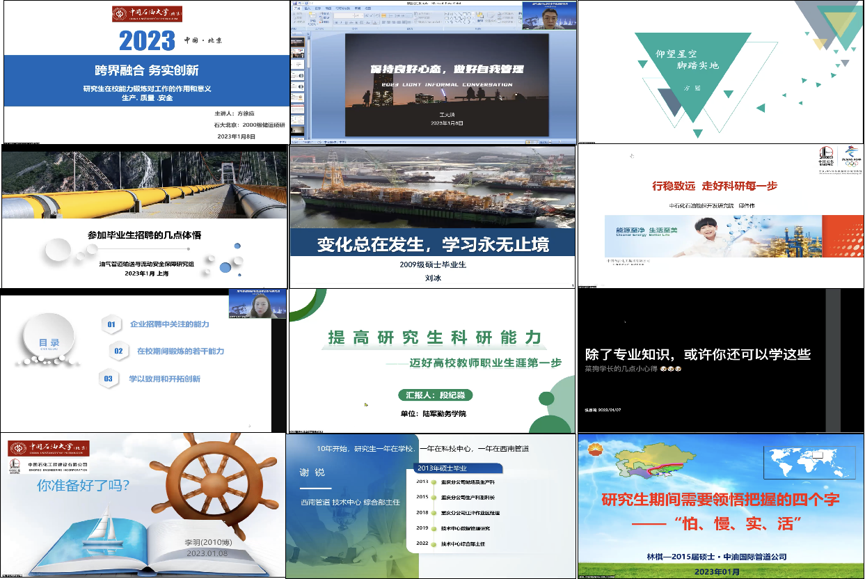 2023年1月8日,機械與儲運工程學院油氣管道輸送與流動安全保障研究組舉辦2023年學術年會。本次會議主題為畢業生工作感悟與經驗分享,由李曉平副教授、溫凱副教授主持。宮敬教授、于達老師、王瑋老師等課題組10名教師,2003屆碩士畢業生、達信(中國)保險經紀有限公司方徐應,2006屆博士畢業生、國家管網西氣東輸分公司吳巖、2007屆碩士畢業生、國家管網油氣調控中心王大鵬等11名課題組優秀畢業生及200余名課題組在校學生和畢業生參加會議。