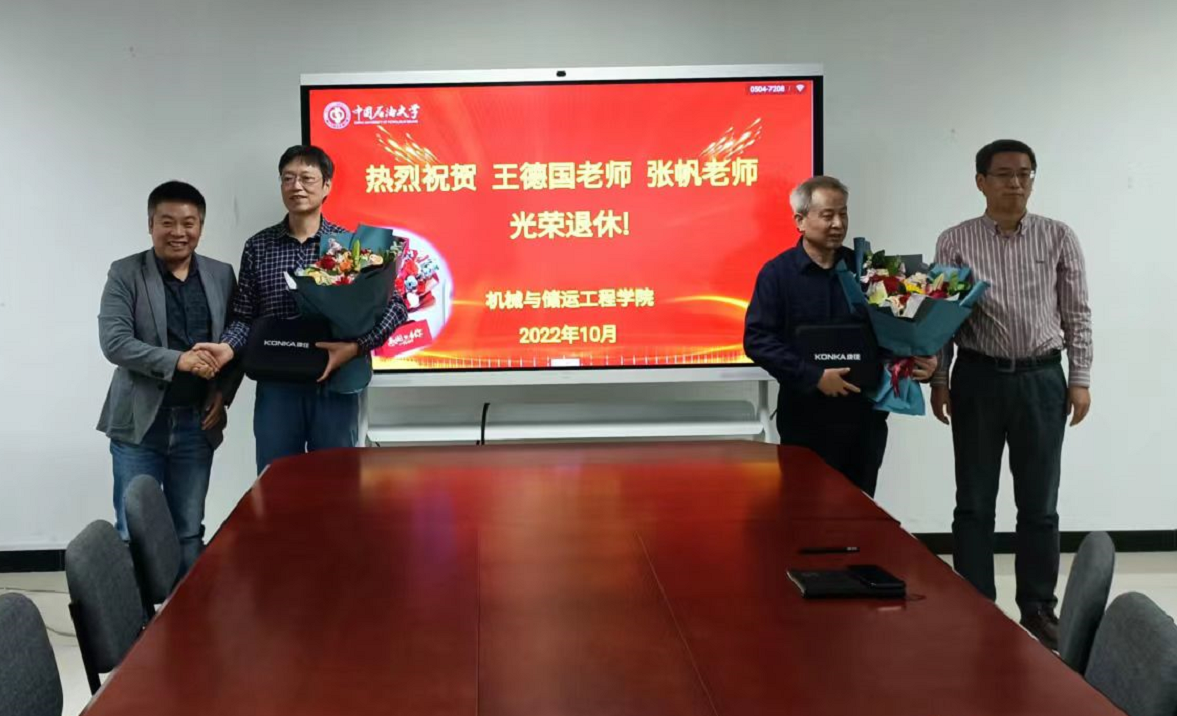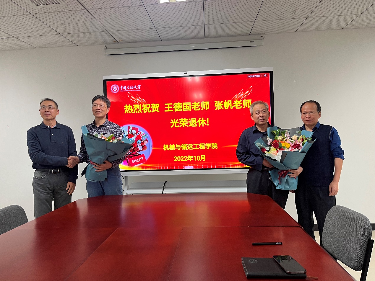10月14日下午,機械與儲運工程學院在院會議室B921舉辦榮休會,院系領導和部分教師代表齊聚一堂,歡送王德國教授和張帆副教授光榮退休。