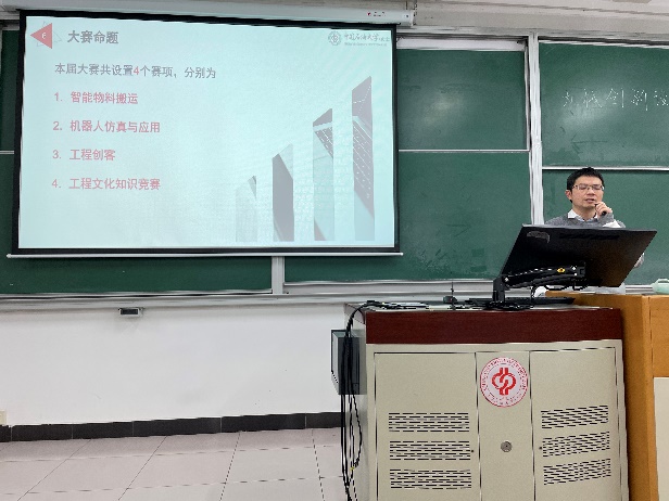 借此機會,肖華平老師還為大家介紹了關于北京市大學生工程實踐與創新能力大賽的相關情況。北京市大學生工程實踐與創新能力大賽包括智能物料搬運、機器人仿真工程知識競賽等4個賽項,肖華平老師對4個賽項做了具體的解讀,為學生參賽作出了指導。