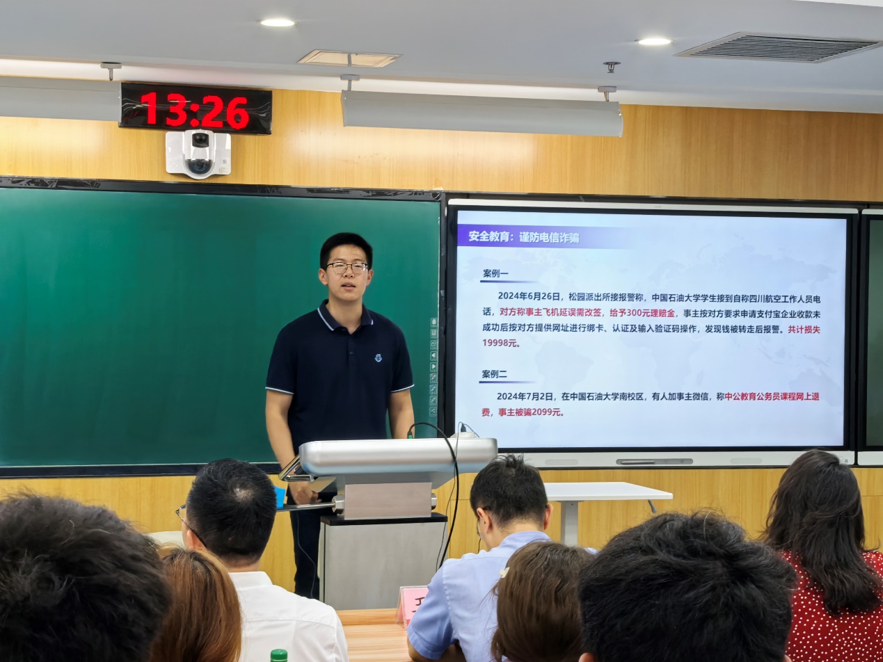 24級本科生輔導(dǎo)員王文輝針對電信詐騙、交通安全、假期管理等方面進行了強調(diào),提醒在場學(xué)生在保證學(xué)業(yè)基礎(chǔ)的同時,加強鍛煉提升體質(zhì),積極參與學(xué)校、學(xué)院組織的各類活動,把大學(xué)生活過得多姿多彩。