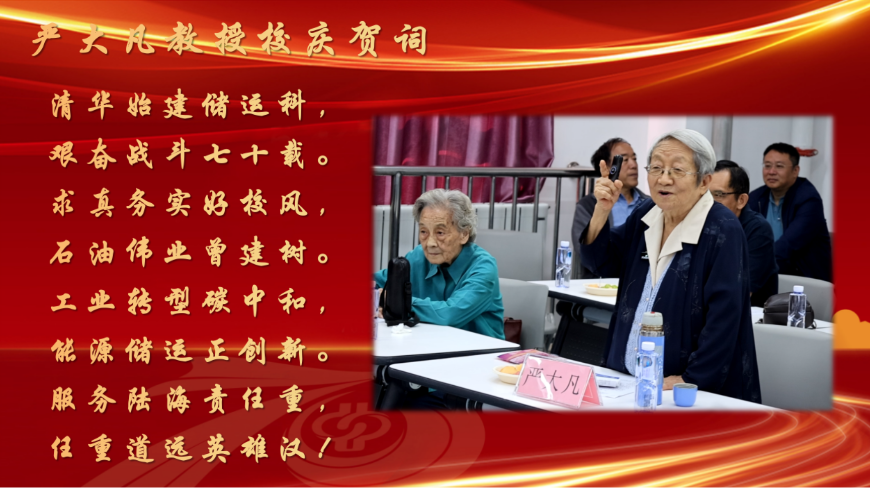 感恩儀式后,嚴(yán)大凡教授對校友表示感謝并即席發(fā)表感言。她回顧了我校創(chuàng)辦儲運(yùn)專業(yè)的歷史,介紹了任教53年的心得和經(jīng)驗(yàn),并為儲運(yùn)專業(yè)致70年校慶賀詞:清華始建儲運(yùn)科,艱奮戰(zhàn)斗七十載。求真務(wù)實(shí)好校風(fēng),石油偉業(yè)曾建樹。工業(yè)轉(zhuǎn)型碳中和,能源儲運(yùn)正創(chuàng)新。服務(wù)陸海責(zé)任重,任重道遠(yuǎn)英雄漢!