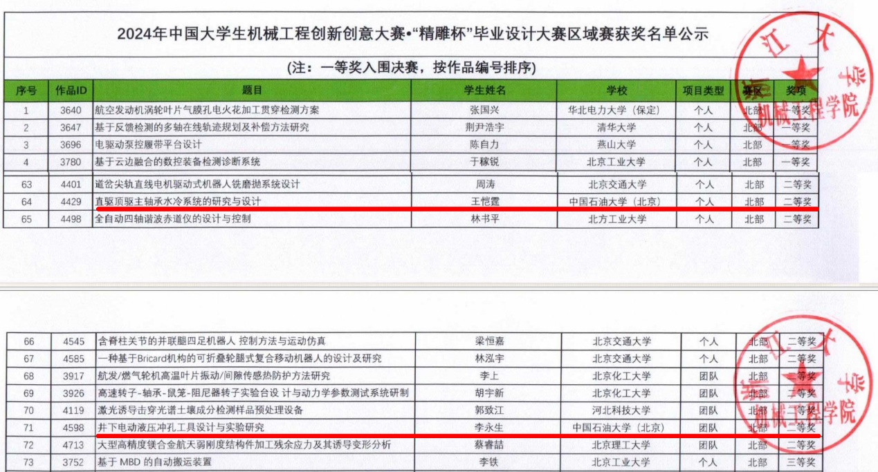 2024年5月23日,第七屆中國大學生機械工程創新創意大賽·“精雕杯”畢業設計大賽獲獎名單揭曉,中國石油大學(北京)學子在該賽事中斬獲佳績:由機械與儲運工程學院特任崗位副教授王暾指導的“直驅頂驅主軸承水冷系統的研究與設計”(學生姓名:王愷霆)榮獲北部賽區個人賽二等獎,副教授王文明指導的“井下電動液壓沖孔工具設計與實驗研究”(學生姓名:李永生、田樹輝、張旭、姚鑫哲、劉志澤)榮獲北部賽區團隊賽二等獎。