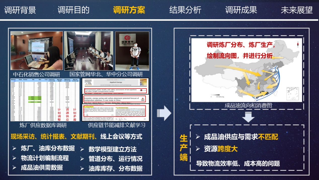 團隊在經過前期充分調研的基礎上,總結我國成品油供應鏈面臨問題,以中石油、中石化供應鏈系統為原型,圍繞生產、儲存和運輸三大環節,開展了煉油產能調整、油庫庫容整合優化研究,并對國家管網獨立運營后的價格策略進行深入分析,最終形成了一種成品油供應鏈多環節優化技術,量化供應鏈優化方案,從智慧化、部門協調和行業協調方面提出政策建議,促進我國成品油供應鏈持續健康發展。目前,研究成果已在國家管網華北、華南、華中三個大區開展試點化應用并產生實際經濟效益。