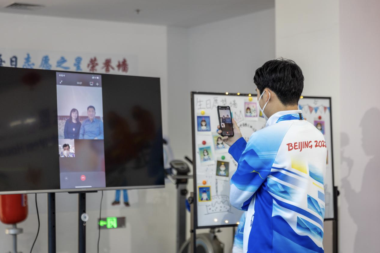 生日會上還有一個特殊的環(huán)節(jié)。前期,志愿者團隊了解到,志愿者閆宏偉的父親閻斌是2008年北京冬奧會鳥巢外立面的光照設(shè)計師,在集體生日會現(xiàn)場,連接“兩代奧運人”的視頻連線開啟。