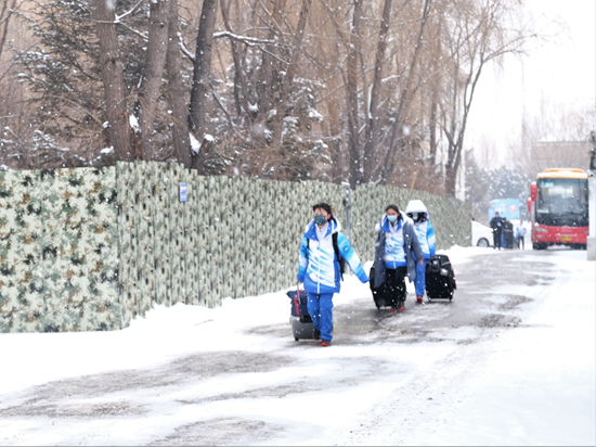 北京2022年冬奧會和冬殘奧會延慶賽區駐地,志愿者們迎雪走進閉環住宿區。尹希寧/攝