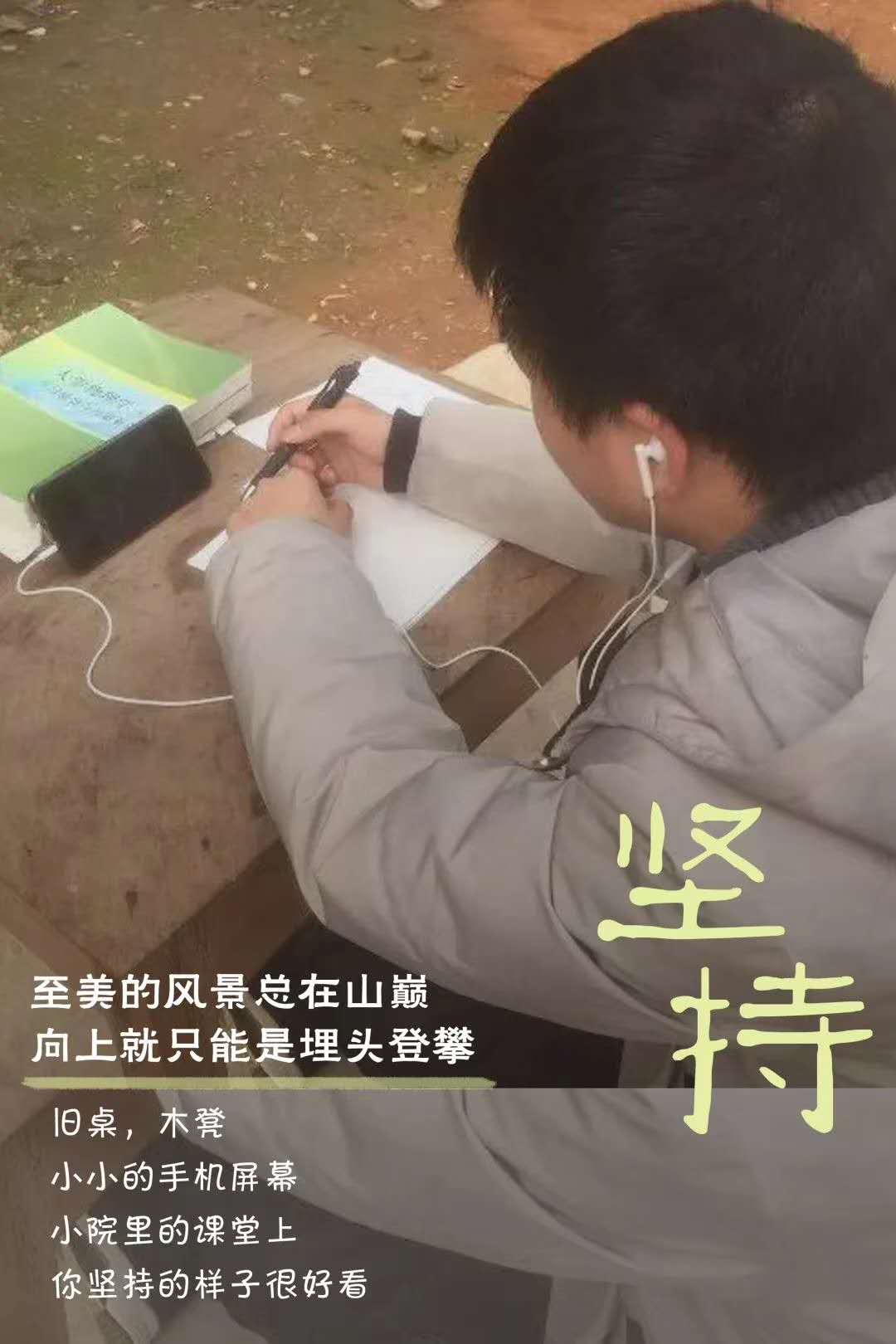 至美的風(fēng)景總在山巔,向上就只能是埋頭登攀,小桌、木凳,小小的手機(jī)屏幕,小院里的課堂上,你堅持的樣子很好看。