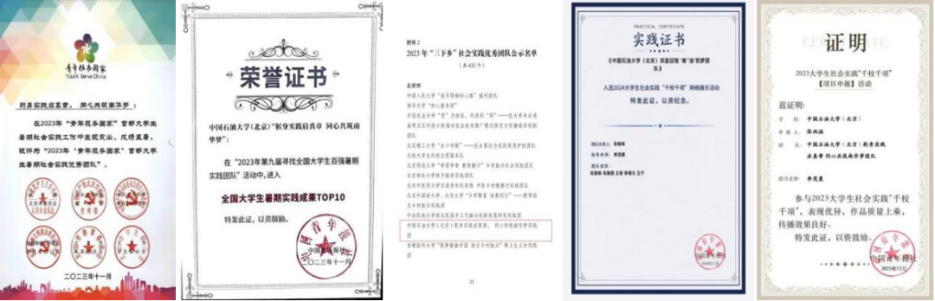 實踐團隊先后獲評全國大學生暑期實踐成果TOP10,全國大學生“三下鄉”社會實踐優秀團隊,全國大學生社會實踐成果“千校千項”優秀項目,“青年服務國家”首都大學生暑期社會實踐優秀團隊等。