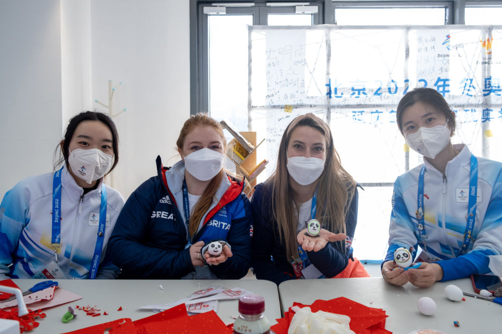 英國(guó)代表團(tuán)成員展示自己制作的粘土冰墩墩。