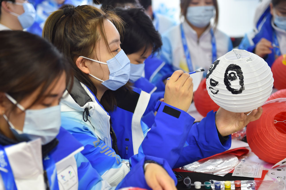 志愿者在制作北京冬奧會(huì)吉祥物“冰墩墩”造型的燈籠