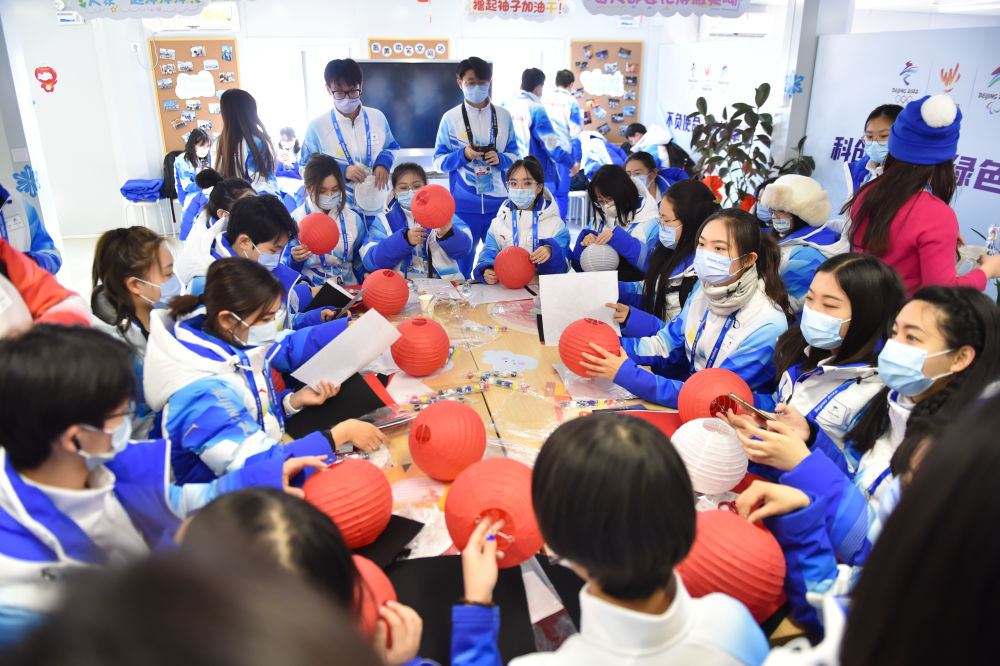 志愿者們?cè)诒本W林匹克公園公共區(qū)志愿者之家制作燈籠