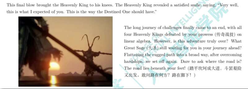 中國青年報客戶端訊(中青報·中青網(wǎng)記者 楊潔)“此刻,一場非凡的‘黑神話’冒險即將啟程,而你,那位‘天命人’,將借助‘線性代數(shù)’的力量,征服四大天王?!痹谥袊痛髮W(xué)(北京)一套8頁的“線性代數(shù)”期末試卷中,全英文的試題里設(shè)計了一套用知識打贏“黑神話”的游戲。