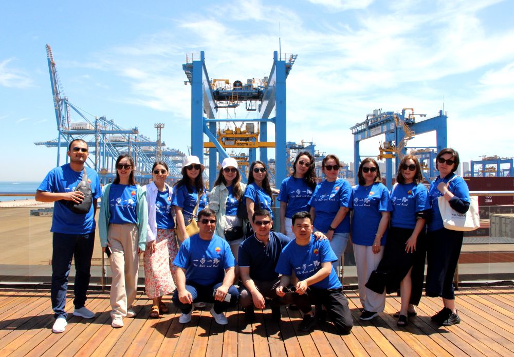 學員們參觀青島港自動化碼頭時合影留念(6月27日攝)。新華社發