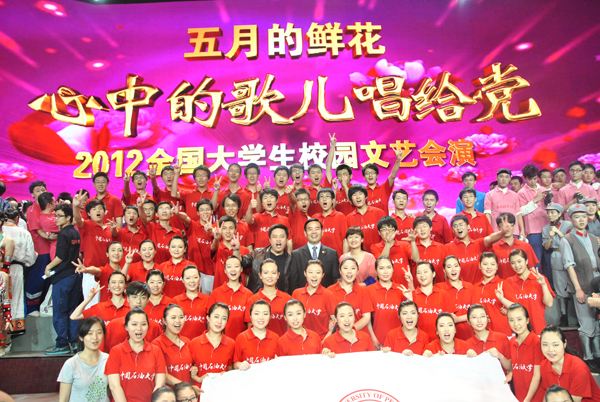 展示青春的風采,唱響心中的贊歌。由中宣部、教育部、共青團中央主辦,中央電視臺承辦的全國大學生校園文藝會演《五月的鮮花––心中的歌兒唱給黨》54日晚在中央電視臺一號演播大廳隆重上演,來自全國近百所高校的2500多名大學生參加演出,中國石油大學60名學生參演的大合唱《迎風飄揚的旗》被安排在第三十個節目,壓軸出場。