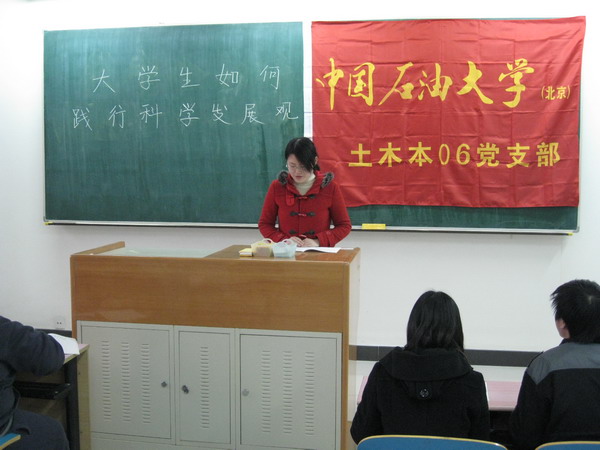 3月30日,土木本06黨支部三教406舉行了“深入學(xué)習(xí)實(shí)踐科學(xué)發(fā)展觀系列活動(dòng)之‘做一次討論,讀一本理論專著,寫一篇學(xué)習(xí)心得’”的主題黨日活動(dòng)。