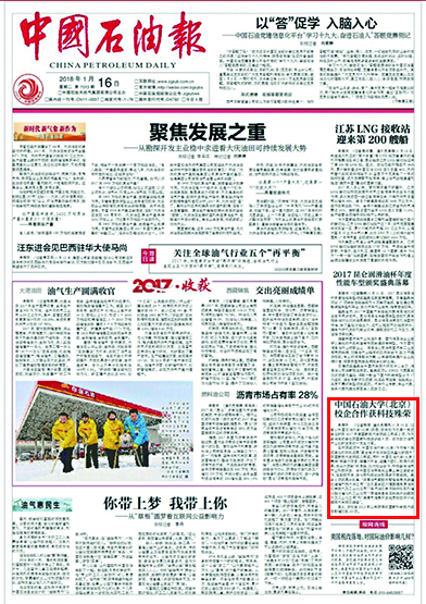 中國石油報頭版報道石大6項科研成果獲2017年度國家科學技術獎