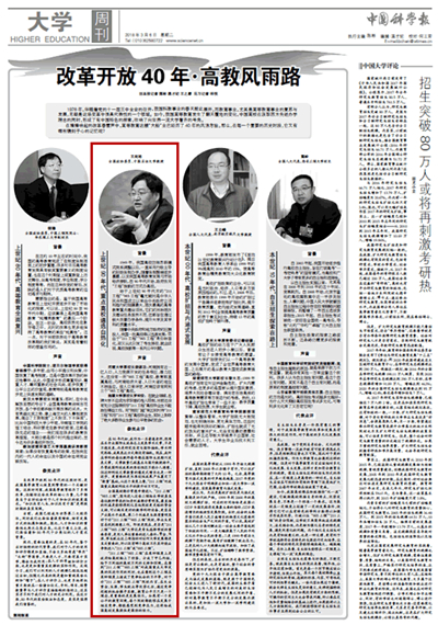 3月6日,《中國科學報》“大學周刊”版面刊發專題文章《開放40年•高教風雨路》,報道了全國政協委員、石大地球物理與信息工程學院教授王尚旭關于高等教育發展進程中重點高校遴選制度對于高校和教師發展影響的看法。