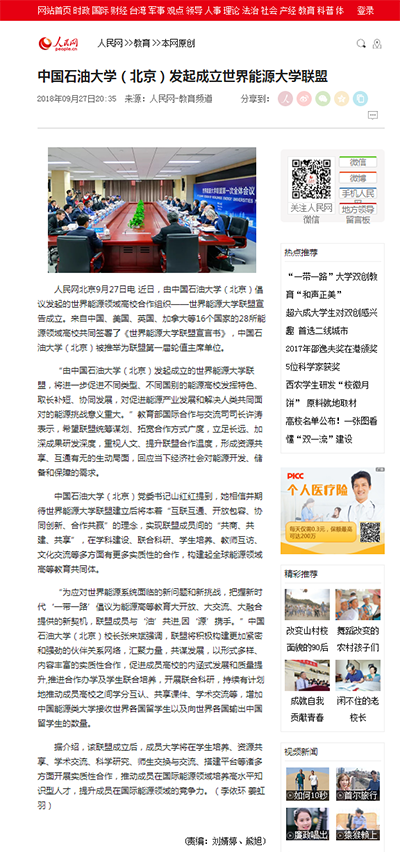 人民網教育頻道9月27日以“中國石油大學(北京)發起成立世界能源大學聯盟”