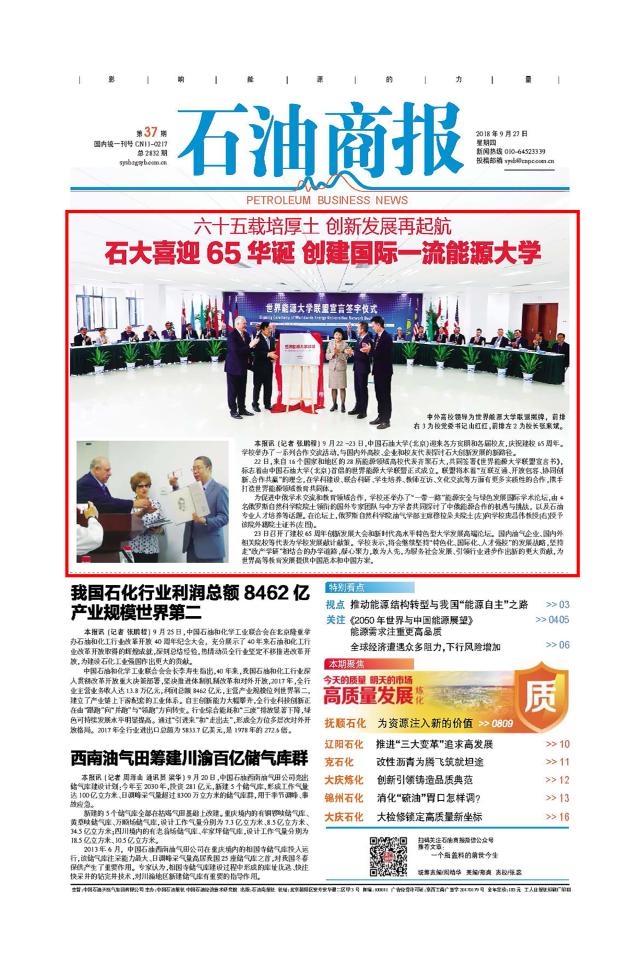 9月27日出版的石油商報在頭版頭條位置以“六十五載培厚土 創新發展再起航——石大喜迎65華誕 創建國際一流能源大學”報道世界能源大學聯盟成立及65周年校慶系列活動