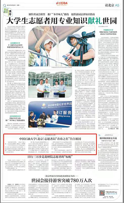 北京青年報(bào)報(bào)道石大世園會(huì)志愿者以“青春之名”告白祖國(guó)