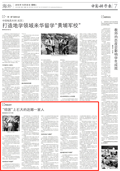 10月30日,中國科學(xué)報海外版第七版以《“組團(tuán)”上石大的達(dá)娜一家人》為題,從“中國夢”、“中國情”、“中國家”三個方面講述了在石大學(xué)習(xí)的哈薩克斯坦姑娘達(dá)娜一家人“組團(tuán)”上石大的故事。