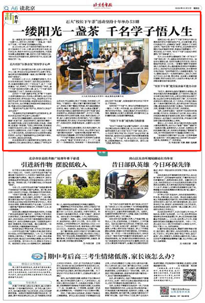 石大2008級學生潘曉參加了第一次“校長下午茶”活動,那一天,她就坐在張來斌的左手邊。她告訴北青報記者,當時的場景還歷歷在目,張校長跟她開玩笑說,1980年,一封署名“潘曉”的讀者來信《人生的路呵,怎么越走越窄》發表在《中國青年》雜志上,剛好她與這位讀者同名同姓。校長意味深長地對她說:“但我希望你的人生路越走越寬。”如今,潘曉已經成為一位資深的媒體人,她認為,張校長不僅對人生價值、責任使命、生命意義有著深邃的理解,同時也將自己的人生經歷分享給大家,深深感染著在場的每位同學。