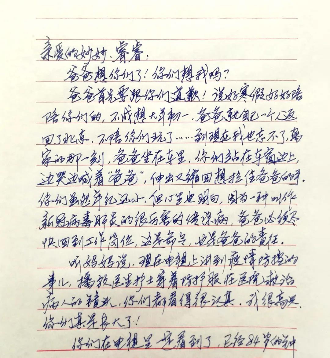 爸爸要先跟你們道歉,說好寒假好好陪你們的,不成想大年初一,爸爸就自己一個人返回北京,不陪你們玩了……到現(xiàn)在我也忘不了,離家的那一刻,爸爸坐在車?yán)铮銈冋驹谲嚧斑吷?,邊哭邊喊著“爸爸”,伸出又縮回想拉住爸爸的手。你們雖然年紀(jì)還小,但心里也明白,因為一種叫作新型冠狀病毒肺炎的很厲害的傳染病,爸爸必須盡快回到工作崗位,這是命令,也是爸爸的責(zé)任。