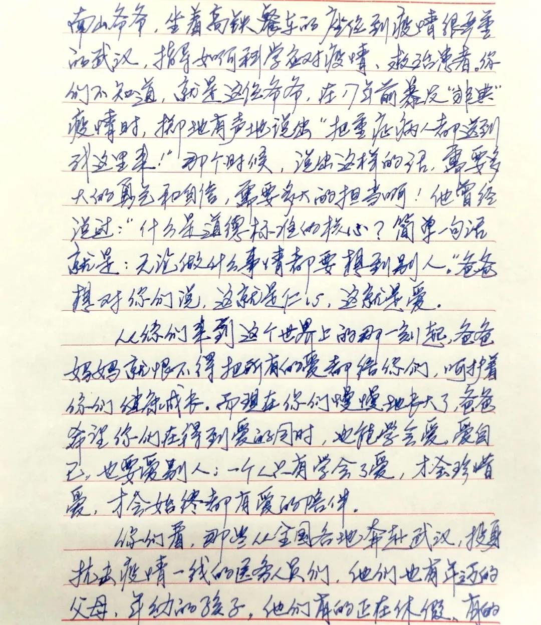 你們在電視里一定看到了,已經(jīng)84歲的鐘南山爺爺,坐著高鐵餐車的座位到疫情很嚴(yán)重的武漢,指導(dǎo)如何科學(xué)應(yīng)對疫情、救治患者。你們不知道,就是這位爺爺,在17年前爆發(fā)“非典”疫情時,擲地有聲地說:“把重癥病人都送到我這里來!”那個時候,說出這樣的話,需要多大的自信和勇氣,需要多大的擔(dān)當(dāng)??!他曾說過:“什么是道德標(biāo)準(zhǔn)的核心?簡單一句話就是:無論做什么事情都要想到別人?!卑职窒雽δ銈冋f,這就是仁心,這就是愛。