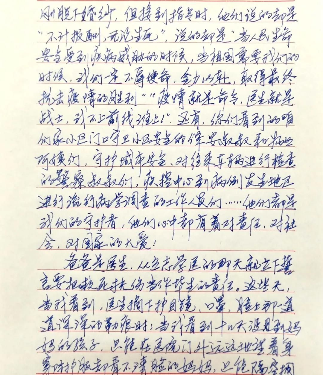 爸爸是醫(yī)生,從立志學(xué)醫(yī)的那天就立下誓言要把救死扶傷當(dāng)作畢生的責(zé)任。這些天,當(dāng)我看到,醫(yī)生摘下護目鏡、口罩,臉上那一道道深深的勒痕時;當(dāng)我看到十幾天沒見到媽媽的孩子,只能在醫(yī)院門外遠(yuǎn)遠(yuǎn)地望著身穿防護服卻看不清臉的媽媽,只能隔空擁抱媽媽、默默流淚時;當(dāng)我看到,身在抗疫一線的護士,接到母親去世的消息,悲痛淚流,向著家的方向三鞠躬時……爸爸一次次忍不住眼眶里的淚水,因為感動,因為心疼,也有同為醫(yī)者的驕傲……孩子們,或許你們現(xiàn)在還不能完全明白這些,但是爸爸要跟你們講,一個心里只有自己沒有別人的人,是不懂得真正的愛的;只有他心里裝得下別人,能夠為他人的幸福奉獻,才能獲得別人的愛和尊重,人生才更有價值,才會得到更多的幸福!