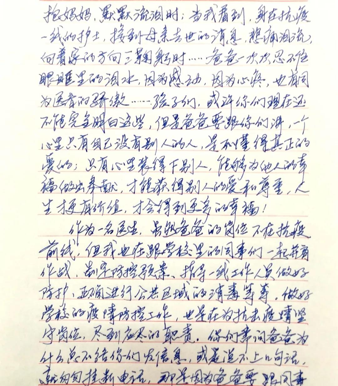 作為一名醫(yī)生,雖然爸爸的崗位不在抗疫前線,但我也在跟學(xué)校的同事們一起并肩作戰(zhàn),制定防控預(yù)案、指導(dǎo)一線工作人員做好防護、正確進行公共區(qū)域的消毒等等。做好學(xué)校的疫情防控工作,也是在為抗擊疫情堅守崗位,盡到應(yīng)盡的職責(zé)。你們常問爸爸為什么總不給你們發(fā)信息,或者是說不上幾句話,就匆匆掛斷電話,那是因為爸爸要跟同事們一起商量如何才能不讓病毒攻進學(xué)校大門,保護好大家的安全。為了打贏這場仗,我們都非常努力!