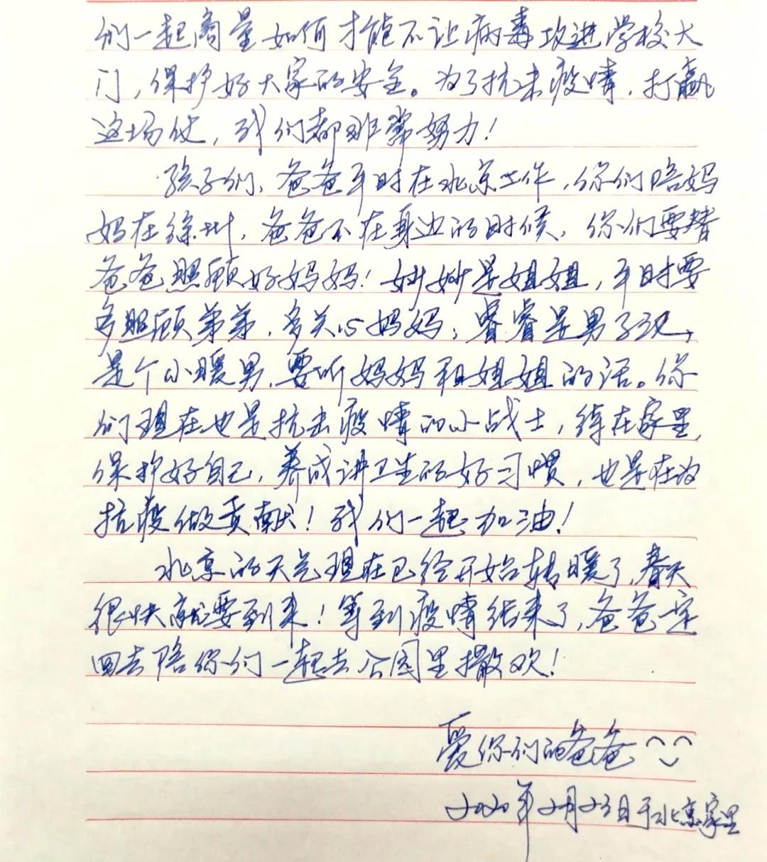 孩子們,爸爸平時在北京工作,你們陪媽媽在徐州,爸爸不在身邊的時候,你們要替老爸照顧好媽媽!妙妙是姐姐,平時要多照顧弟弟,關(guān)心媽媽。睿睿是男子漢,是個小暖男,要聽媽媽和姐姐的話。你們現(xiàn)在也是抗擊疫情的小戰(zhàn)士,待在家里,保護好自己,養(yǎng)成講衛(wèi)生的好習(xí)慣,也是在為抗疫做貢獻!我們一起加油!